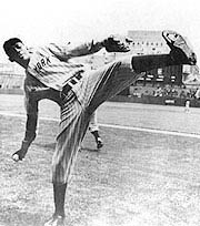 In 1948: After years of pitching in the Negro Leagues, Leroy Satchel Paige makes his first Major League start for the Cleveland Indians at the age of 42 (nobody was ever sure of his exact age, however). Paige pitched seven innings in a 5-3 victory over the St. Louis Browns. It seemed that the legend of Paige was just as great as the pitcher himself, as Joe DiMaggio once called him the fastest and best pitcher Ive ever seen, (according to Paiges official website). Although there were very few official records in the Negro Leagues, it was believed that Paige once threw 64 straight shutout innings (Orel Hershiser holds the ML record with 59), won 21 consecutive games (Carl Hubbell had 24) and once had a 31-4 season. Paige pitched in the majors until he was 59 years old. He helped the Indians win the World Series in 1948 and was inducted into the Hall of Fame in 1971.